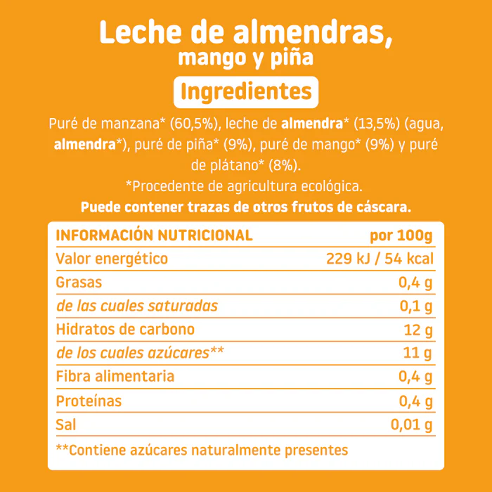 Puré de manzana* (60.5%), leche de almendra*(13.5%) (agua, almendra), puré de piña* (9%), puré de mango* (9%), puré de plátano* (8%). *Procedente de agricultura ecológica.
