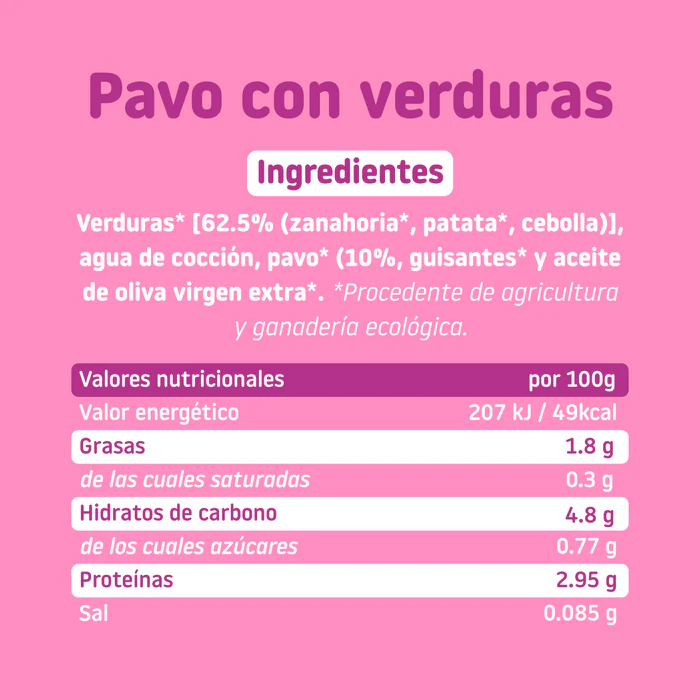 Verduras* [62.5% (zanahoria*, patata*, cebolla*)], agua de cocción, guisantes*, pavo* (10%) y aceite de oliva virgen extra*. *Procedente de agricultura y ganadería ecológica.