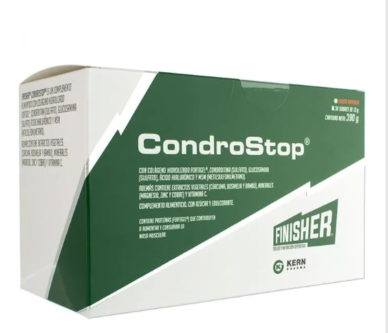 Finisher Condrostop 12 gr 30 Sobres de Kern Pharma es un complemento alimenticio diseñado para apoyar la salud articular. Este producto en polvo se reconstituye fácilmente y está formulado con ingredientes que promueven la flexibilidad y el bienestar de las articulaciones.