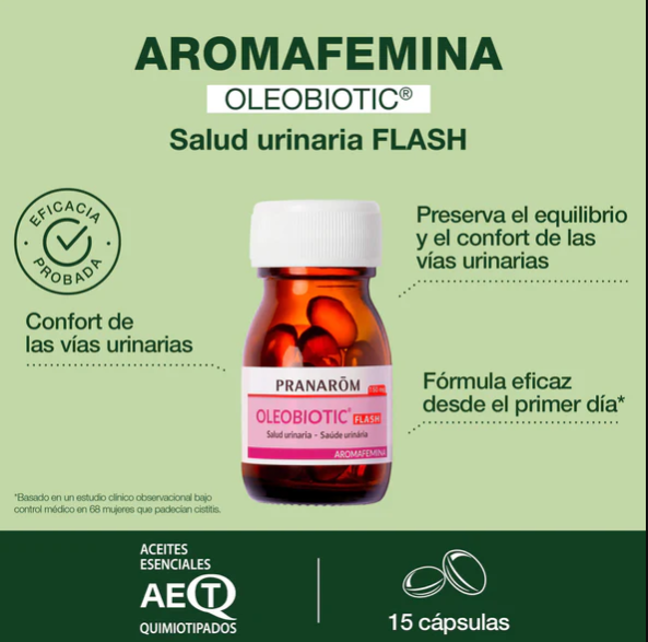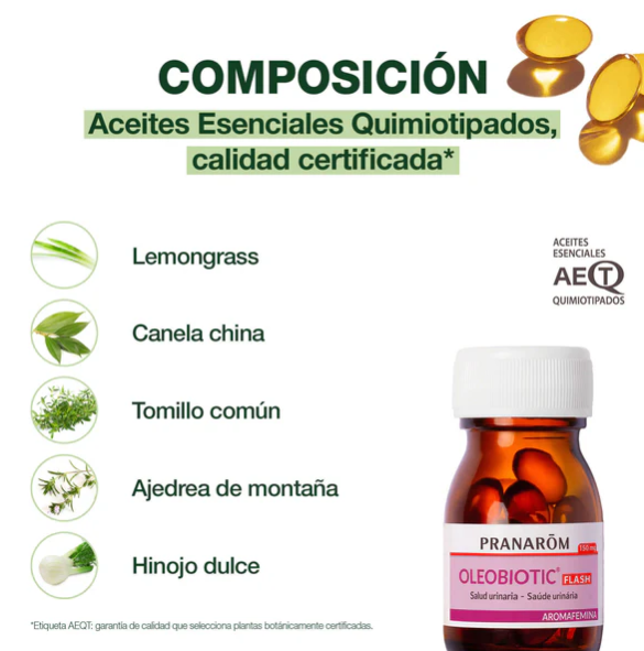 Las cápsulas de salud urinaria Oleobiotic® FLASH contienen una sinergia de Aceites Esenciales de Orégano, Canela y Ajedrea y están enriquecidas con Aceite Esencial de Hinojo, que ayuda al buen funcionamiento de las vías urinarias.
