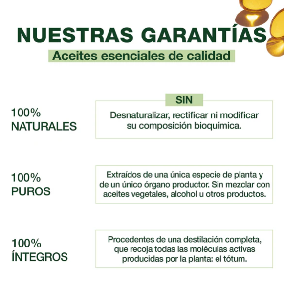 Aceite de Girasol (Helianthus annuus); Gelatina; Gelificante: sorbitol; Aceite esencial de Hierba limón (Cymbopogon citratus – 120 mg); Gelificante: Glicerol; Agua; Aceite esencial de Canela china (Cinnamomum cassia – 90 mg); Gelificante: Pectina; Aceites esenciales : Tomillo común (Thymus vulgaris CT timol – 60 mg), Ajedrea de montaña (Satureja montana – 60 mg), Hinojo dulce (Foeniculum vulgare – 45 mg), Clavo de olor (Eugenia caryophyllus – 30 mg), Orégano común (Origanum vulgare – 30 mg), Cáscara de limón (Citrus limon – 15 mg); Antioxidante: extracto rico en tocoferoles.